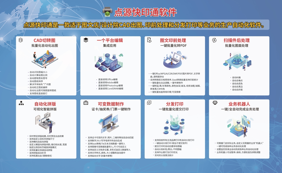 點(diǎn)源快印通軟件(標(biāo)準(zhǔn)版)是專門為圖文快印店/設(shè)計(jì)院定制的一款生產(chǎn)批量化自動化軟件產(chǎn)品,該軟件包括CAD切轉(zhuǎn)圖、印前處理、分發(fā)打印等主要功能,運(yùn)用創(chuàng)新模式-業(yè)務(wù)工作流程自定義業(yè)務(wù)機(jī)器人來實(shí)現(xiàn)企業(yè)自動化生產(chǎn)。