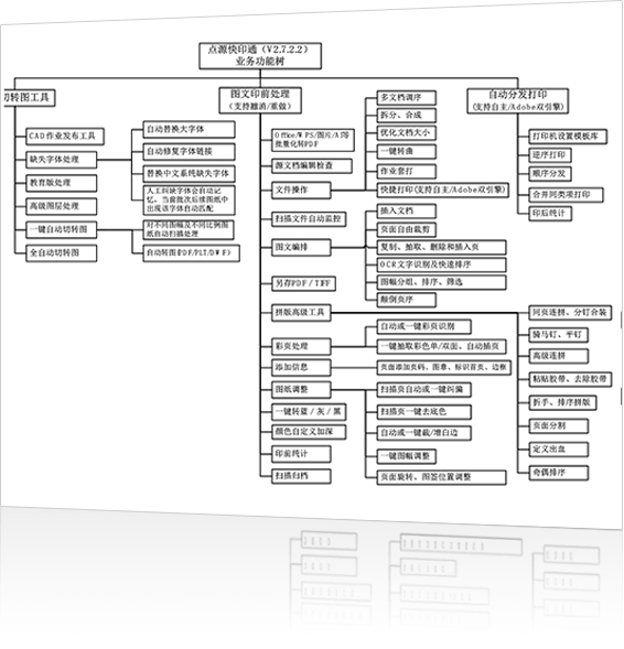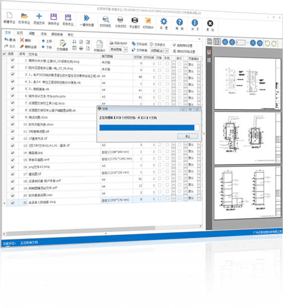 點源快印通(企業(yè)版)是一款針對企業(yè)出版中心普遍存在的痛點所設(shè)計的解決方案。點源科技充分利用自己所掌握的居國內(nèi)領(lǐng)先的包括圖形技術(shù)、PDF處理技術(shù)和打印控制技術(shù)等核心技術(shù),并與國內(nèi)知名圖文快印企業(yè)合作,搭建一個集CAD切轉(zhuǎn)圖、圖文印前處理、分發(fā)打印、打印統(tǒng)計和掃描歸檔等全流程的綜合處理平臺,打破傳統(tǒng)的手工作坊式的出版模式,通過客戶自定義業(yè)務(wù)單元模式實現(xiàn)對不同圖幅與不同繪圖比例的CAD出圖、各文檔轉(zhuǎn)PDF、印前檢查、編排、排序、圖紙調(diào)整、顏色識別與轉(zhuǎn)換、分發(fā)打印、打印統(tǒng)計和掃描歸檔等工作的批量化和自動化,真正意義上解決圖文出版所遇到的處理效率和質(zhì)量方面的痛點,從根本上提升設(shè)計院所或企業(yè)出版中心出版的整體生產(chǎn)效率,實現(xiàn)從傳統(tǒng)出版模式跨越到無人值守的現(xiàn)代數(shù)碼出版模式。