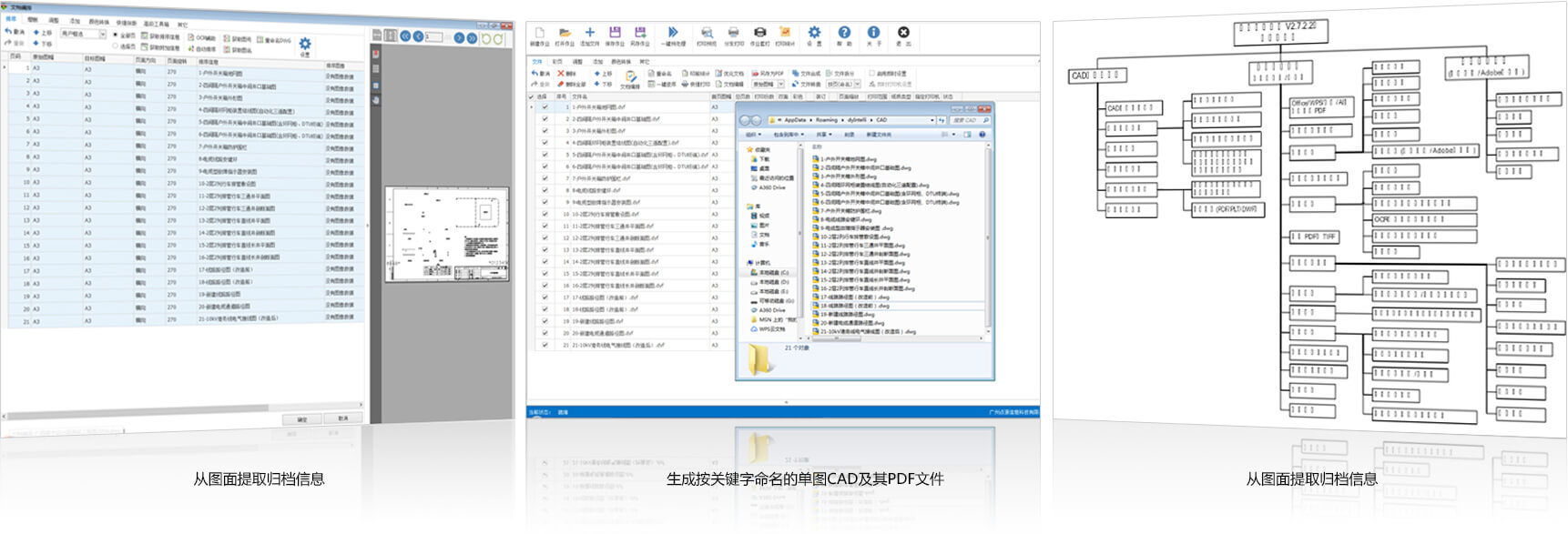 除標準版亮點之外,還支持掃描歸檔、可對CAD圖紙轉(zhuǎn)切成單頁,并可抽取圖面的圖號和圖名等