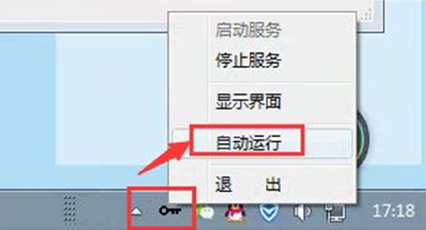 2、即右下角托盤處已啟動服務(wù)器,右擊服務(wù)器圖標(biāo)選擇自動運行,啟動自動運行,每當(dāng)電腦開機就會自動啟動服務(wù)器服務(wù)。見圖2