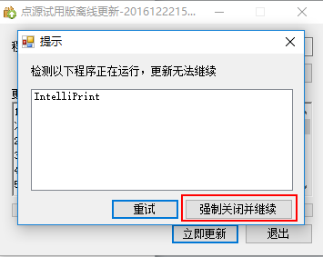 當(dāng)軟件更新時,若已啟動著快印通過軟件,更新包會彈出如下提示,單擊“強制關(guān)閉并繼續(xù)”即可。見圖3