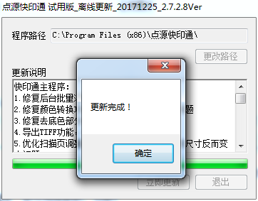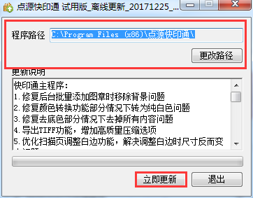 2、雙擊運行離線更新包,選擇點源快印通安裝的路徑(默認(rèn)路徑為:C:\Program Files (x86)\點源快印通2.3\),單擊“立即更新”按鈕即可。(提示:可在“更新說明”中查看更新包所更新的內(nèi)容)。見圖2