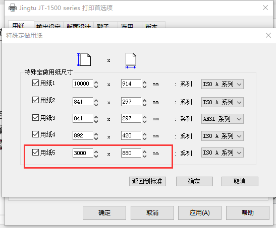 啟用并設置【自定義尺寸5】:(注:此自定義尺寸由點源快印通使用,其尺寸為可能打印圖紙的最大長寬)