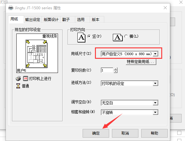 d. 將用紙尺寸修改為之前設置的【用戶自定義5】,然后點擊確定,直接到退出修正。